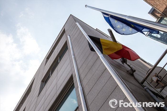 (서울=포커스뉴스) 23일 오전 서울 용산구 주한벨기에 대사관 앞에 지난 22일 벨기에 브뤼셀에서 발생한 동시 다발 테러 희생자들을 추모하는 조기가 게양돼있다.