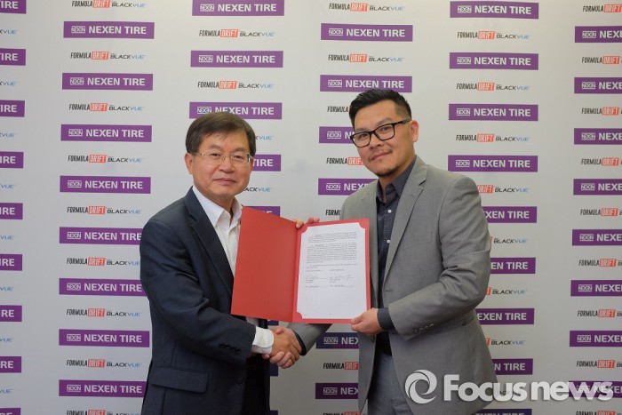 또한 대회에 참가하는 선수 3명과 후원계약을 맺고 타이어를 지원하기로 했다. 후원 계약을 체결한 선수들은 넥센타이어의 '엔페라 SUR4' 타이어를 장착하고 드리프트 경기에 나서게 된다. '엔페라 SUR4' 타이어는 각종 모터스포츠대회를 위해 디자인 된 레이싱 전용 타이어다.권재구 넥센타이어 상무(왼쪽)와 짐 랴우(Jim Liaw) 포뮬러 드리프트 조직위원장이 공식 파트너십을 맺고 있는 모습. <사진제공=넥센타이어>