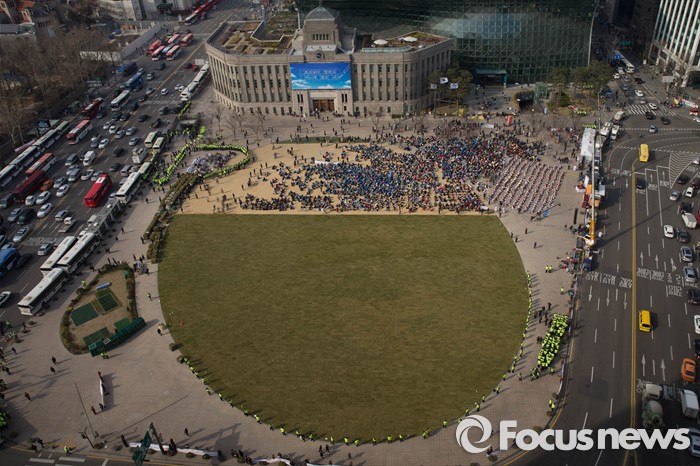 (서울=포커스뉴스) 서울시가 겨울 동안 스케이트장으로 사용됐던 서울광장에 23일 오후 잔디를 새롭게 단장하고 있다. 그러나 시청쪽에서 진행되는 한 종교단체 집회로 나머지 부분은 집회가 끝나기를 기다리고 있다.