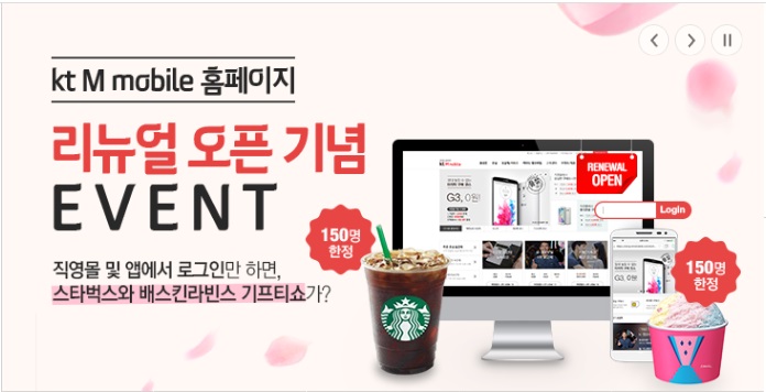 M모바일은 오픈 기념 이벤트로 오는 4월30일까지 직영몰이나 고객센터 앱에 로그인한 고객들 중 300명을 추첨해 스타벅스, 베스킨라빈스 기프티쇼를 증정한다.KT M모바일은 원스톱 직영몰 리뉴얼 홈페이지.<사진=KT M모바일>