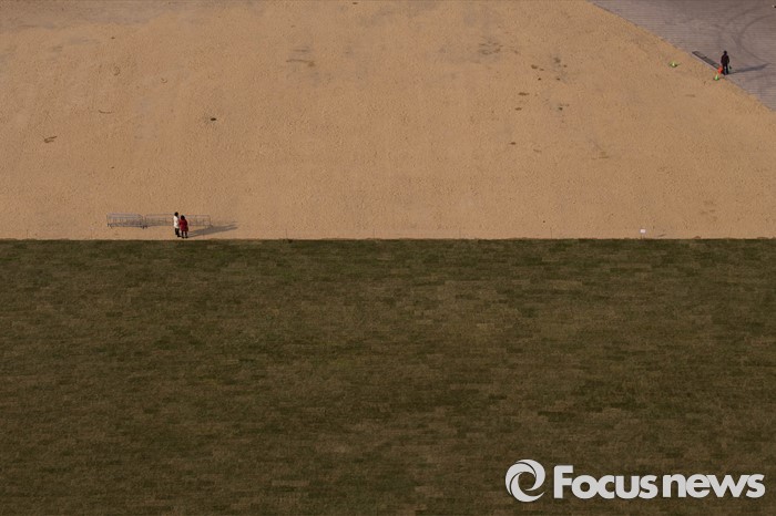 (서울=포커스뉴스) 서울시가 겨울 동안 스케이트장으로 사용됐던 서울광장에 23일 오후 잔디를 새롭게 단장하고 있다