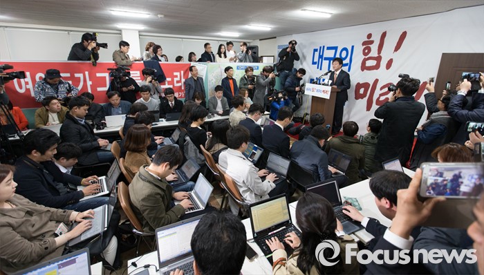(대구=포커스뉴스) 유승민 의원이 23일 오후 대구 동구 용계동 사무소에서 새누리당 탈당 및 무소속 출마 기자회견을 하고 있다.