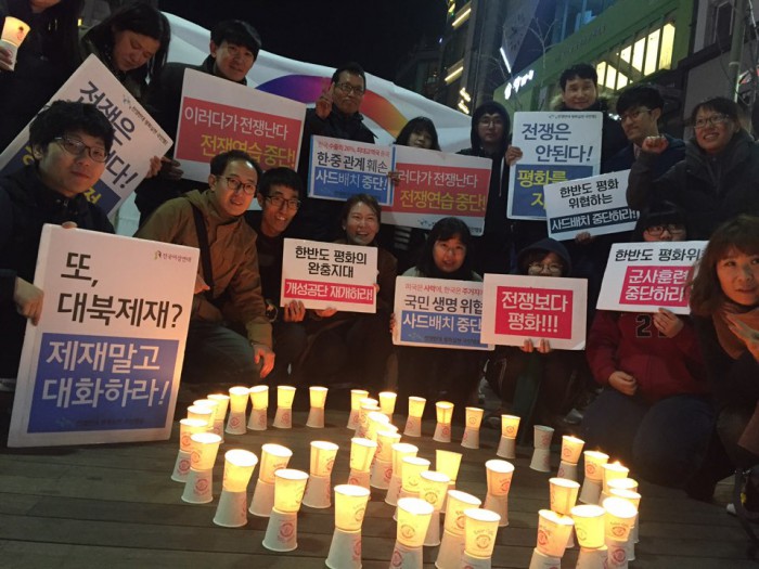 전쟁반대평화실현국민행동은 23일 오후 7시 서울 서대문구 신촌에서 '시민행동 촛불집회'에서 를 열고 한미군사연합훈련과 사드 배치에 대한 시민들의 의견을 모았다.
