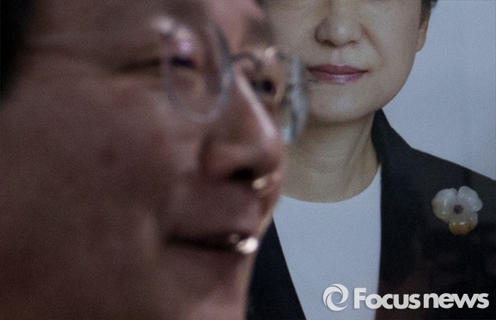 (대구=포커스뉴스) 23일 오후 대구 동구 용계동 사무소에서 새누리당 탈당 및 무소속 출마 기자회견에 앞서 지지자들과 인사를 나누는 유승민 의원 뒤로 박근혜 대통령의 사진이 보이고 있다.