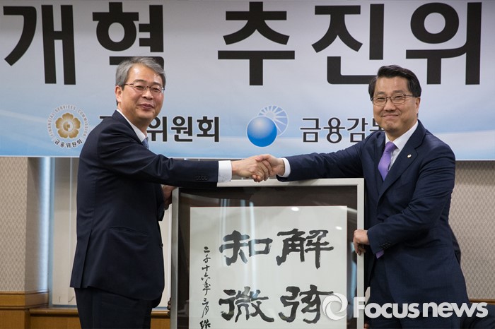 (서울=포커스뉴스) 24일 오전 서울 영등포구 여의도 금융감독원에서 열린 제2차 금융개혁추진위원회에서 진웅섭(오른쪽) 금융감독원장이 임종룡 금융위원장에게 '해현경장 지미지창' 글귀가 담긴 액자를 전달하고 있다.