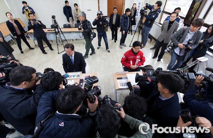 (대구=포커스뉴스) 24일 오전 대구 수성구 선거관리위원회에서 김문수(오른쪽) 새누리당 전 의원과 김부겸 더불어민주당 전 의원이 20대 총선 국회의원 후보 등록을 하고 있다.