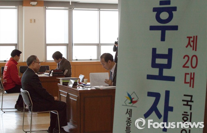 (세종=포커스뉴스) 제20대 국회의원 선거 후보자 등록 첫날인 24일 오전 세종시 조치원읍 세종시선거관리위원회에서 새누리당 박종준 후보와 무소속 이해찬 의원의 대리인이 후보 등록을 하고 있다.