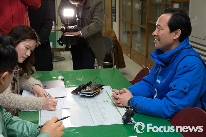 (서울=포커스뉴스) 24일 오전 서울 서대문구 선거관리위원회에서 우상호 더불러민주당 전 의원이 20대 총선 국회의원 후보 등록 서류를 제출 후 등록절차를 기다리고 있다.