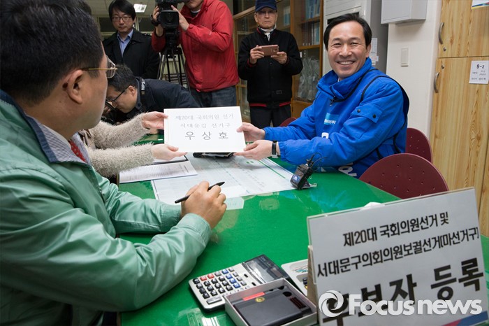 (서울=포커스뉴스) 24일 오전 서울 서대문구 선거관리위원회에서 우상호 더불러민주당 전 의원이 20대 총선 국회의원 후보 등록 서류를 제출하며 기념촬영을 하고 있다.