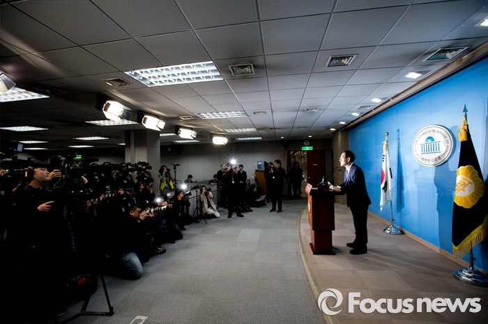 (서울=포커스뉴스) 20대 총선에서 새누리당 공천을 받지 못한 주호영(대구 수성을) 의원이 24일 오전 서울 영등포구 국회 정론관에서 무소속 출마 발표를 하고 있다.