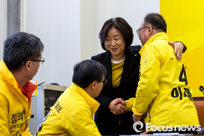 (서울=포커스뉴스) 심상정 정의당 상임대표가 24일 오전 서울 영등포구 국회에서 열린 '20대 국회의원총선거 공천장 수여식'에 참석해 공천을 받은 후보들과 인사 하고 있다.