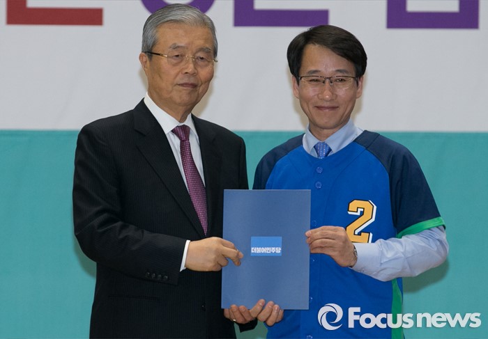 (서울=포커스뉴스) 김종인(왼쪽) 더불어민주당 비대위 대표가 24일 오전 서울 여의도 국회에서 공천장 수여식에 참석해 이원욱(경기 화성을) 의원에게 공천장을 전달한 뒤 기념촬영을 하고 있다.