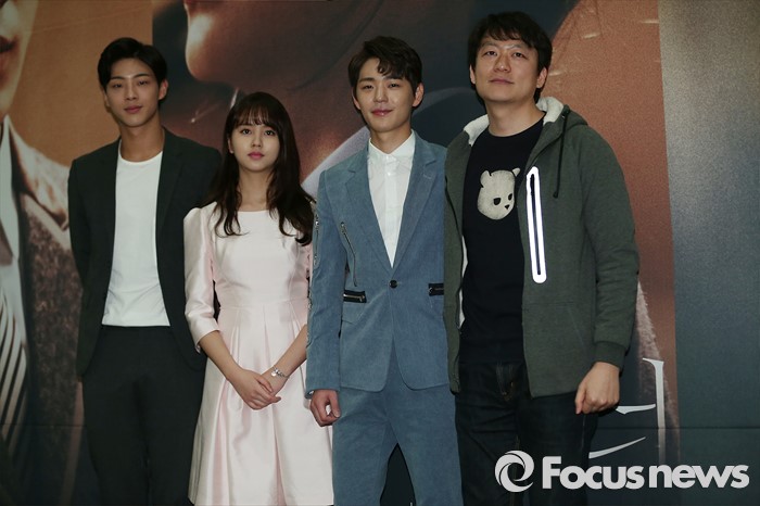 (서울=포커스뉴스) 24일 오전 서울 영등포구 63컨벤션센터에서 열린 KBS 2TV 청춘 3부작 드라마 '페이지터너' 제작발표회에 참석한 배우 지수(왼쪽부터), 김소현, 신재하와 이재훈 PD가 포토타임을 갖고 있다.