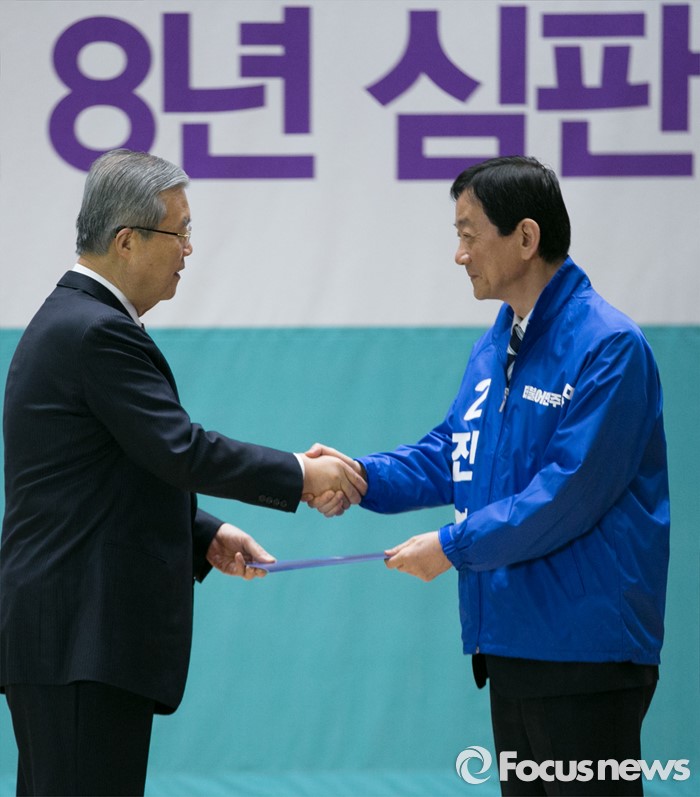 (서울=포커스뉴스) 김종인(왼쪽) 더불어민주당 비대위 대표가 24일 오전 서울 여의도 국회에서 공천장 수여식에 참석해 진영 의원(서울 용산)에게 공천장을 전달하고 있다.