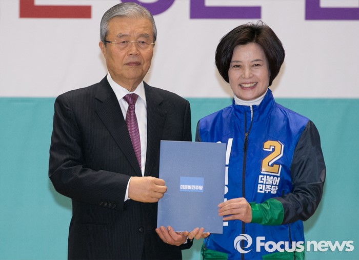 (서울=포커스뉴스) 김종인(왼쪽) 더불어민주당 비대위 대표가 24일 오전 서울 여의도 국회에서 공천장 수여식에 참석해 이정근 서울 서초갑 후보에게 공천장을 전달한 뒤 포즈를 취하고 있다.