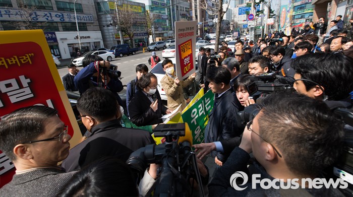 (인천=포커스뉴스) 새누리당을 탈당한 윤상현 의원의 무소속 출마 선언 기자회견이 열린 24일 오전 인천 남구 지역구 사무실 앞에서 2016 체인지 총선네트워크 인천유권자위원회 회원들이 윤상현 의원 출마 규탄 기자회견을 하고 있다.
