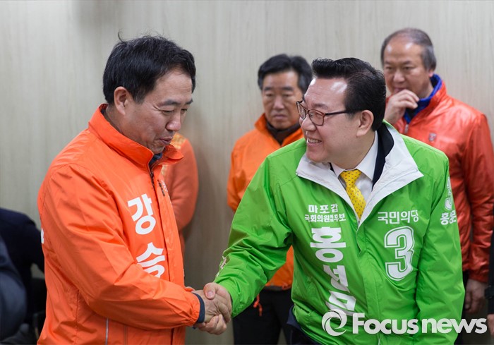 (서울=포커스뉴스) 20대 총선 후보자 등록이 시작된 24일 오전 서울 마포구 선관위에서 강승규(왼쪽) 무소속 후보가 홍성문 국민의당 후보와 악수하고 있다.