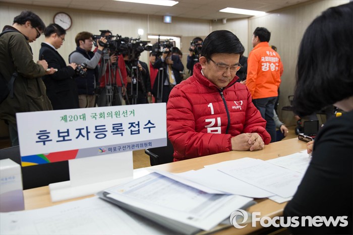 (서울=포커스뉴스) 20대 총선 후보자 등록이 시작된 24일 오전 서울 마포구 선관위에서 김성동 새누리당 후보가 등록 절차를 밟고 있다.