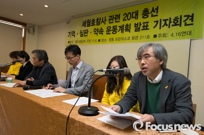 (서울=포커스뉴스) 24일 오전 서울 중구 프란치스코 회관에서 이태호 4.16연대 삼임운영위원이 세월호참사 관련 20대 총선 기억·심판·약속 운동계획 발표를 하고 있다.