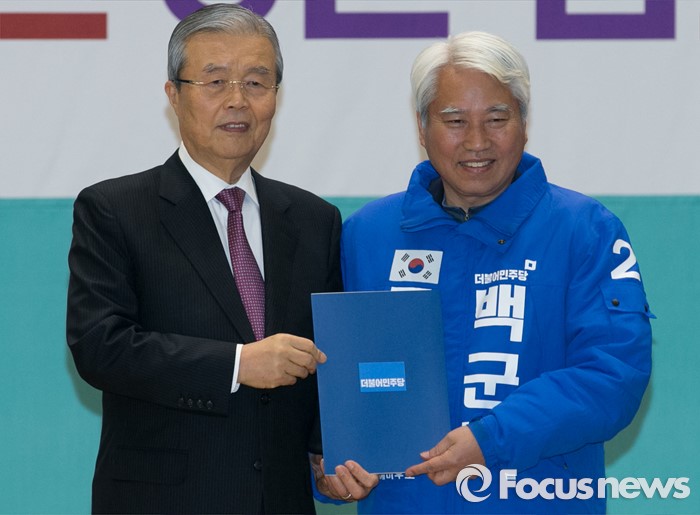 (서울=포커스뉴스) 김종인(왼쪽) 더불어민주당 비대위 대표가 24일 오전 서울 여의도 국회에서 공천장 수여식에 참석해 백군기(경기 용인갑) 의원에게 공천장을 전달한 뒤 기념촬영을 하고 있다.