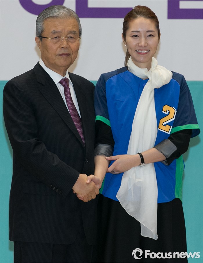 (서울=포커스뉴스) 김종인 더불어민주당 비대위 대표가 24일 오전 서울 여의도 국회에서 공천장 수여식에 참석해 강선우 비례대표 후보와 기념촬영을 하고 있다.