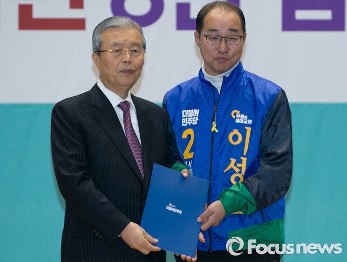 (서울=포커스뉴스) 김종인(왼쪽) 더불어민주당 비대위 대표가 24일 오전 서울 여의도 국회에서 공천장 수여식에 참석해 이성만 인천 부평갑 후보와 함께 기념촬영을 하고 있다.