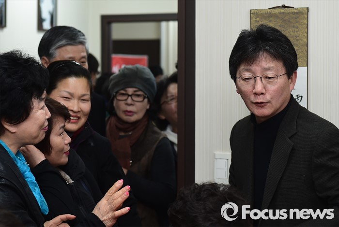 (대구=포커스뉴스) 전날 새누리당 탈당과 함께 무소속 출마를 선언한 대구 동구을 유승민 의원이 24일 오후 대구 동구의 사무소에서 지지자들과 만나 이야기를 나누고 있다.