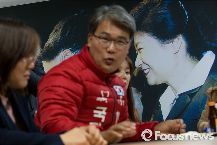 (대구=포커스뉴스) 24일 오후 대구 동구 방촌동의 이재만(대구 동구을) 후보 선거사무소에서 지지자들과 이야기를 나누는 이 후보 뒤로 박근혜 대통령의 사진이 보이고 있다.