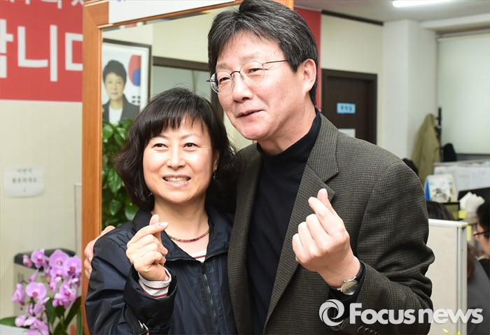 (대구=포커스뉴스) 전날 새누리당 탈당과 함께 무소속 출마를 선언한 대구 동구을 유승민 의원이 24일 오후 대구 동구의 사무소에서 한 지지자와 기념촬영을 하고 있다.
