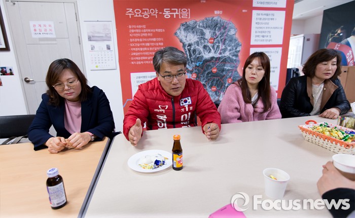 (대구=포커스뉴스) 이재만 예비후보(대구 동구을)가 24일 오후 대구 동구 방촌동의 선거사무소에서 지지자들과 만나 이야기를 나누고 있다.