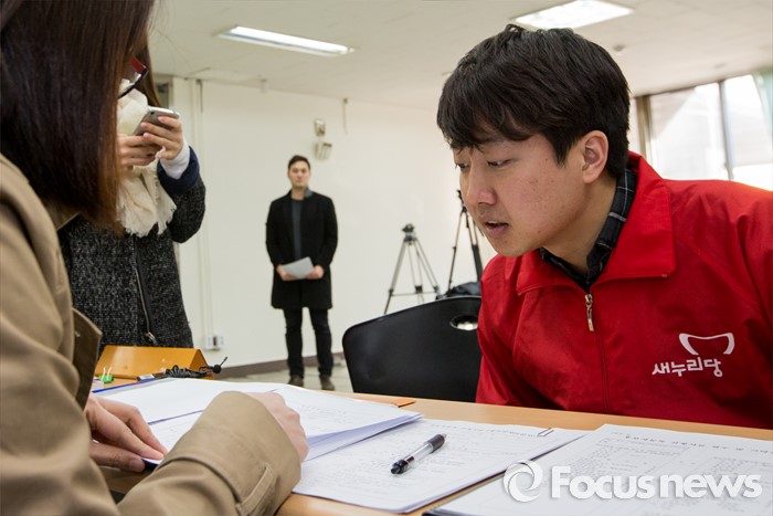 (서울=포커스뉴스) 4·13 총선 후보자 등록 첫 날인 24일 오후 서울 노원구선거관리위원회를 찾은 이준석 새누리당 노원병 후보가 후보자 등록을 하고 있다.
