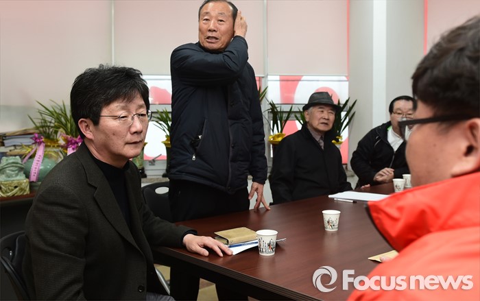 (대구=포커스뉴스) 전날 새누리당 탈당과 함께 무소속 출마를 선언한 대구 동구을 유승민 의원이 24일 오후 대구 동구의 사무소에서 지지자들과 만나 이야기를 나누고 있다.