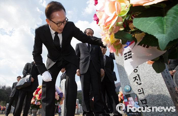 (대전=포커스뉴스) 이명박 전 대통령이 제1회 서해수호의날을 하루 앞둔 24일 오전 대전 유성구 국립대전현충원 천안함 46용사 묘역을 둘러보고 있다.
