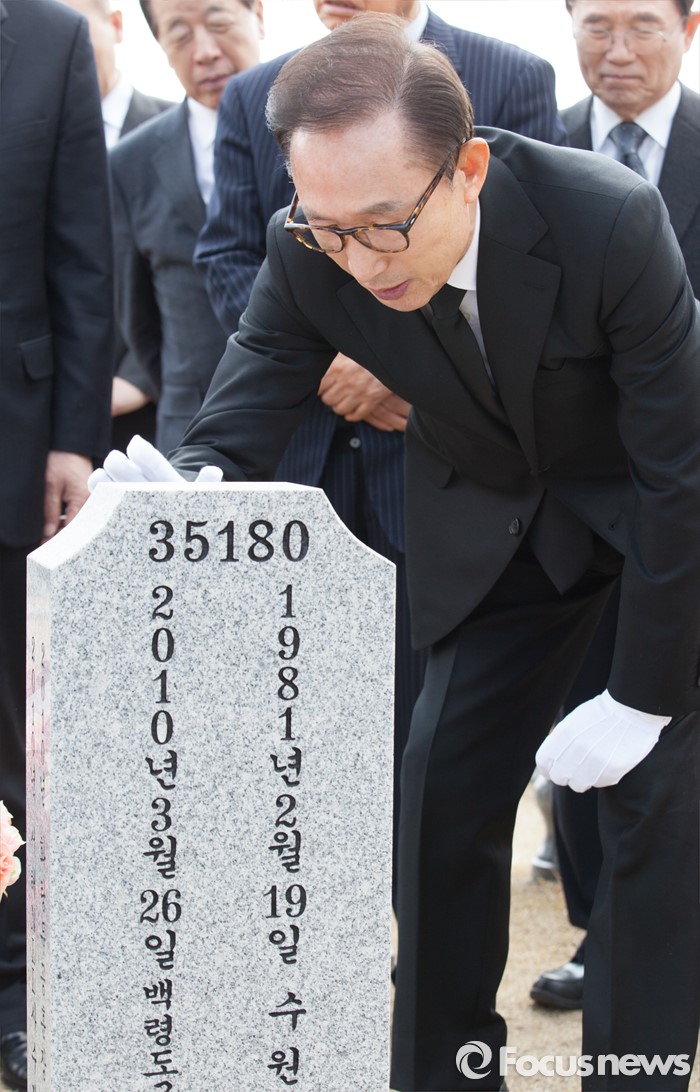 (대전=포커스뉴스) 이명박 전 대통령이 제1회 서해수호의날을 하루 앞둔 24일 오전 대전 유성구 국립대전현충원 천안함 46용사 묘역을 둘러보고 있다.