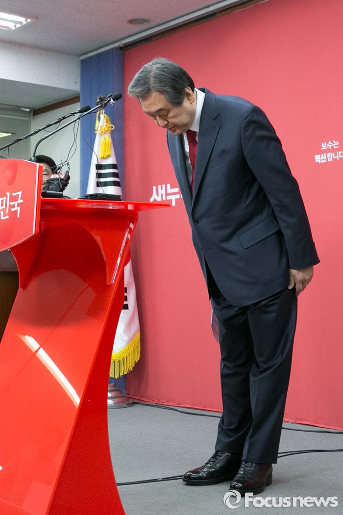 (서울=포커스뉴스) 김무성 새누리당 대표가 24일 오후 서울 여의도 당사 브리핑실에서 기자회견을 마친 뒤, 인사하고 있다. 이 자리에서 김 대표는 "서울 은평구(을), 송파구(을), 대구 동구(갑), 동구(을), 달성군 등 최고위 의결이 보류된 5곳에 대한 공천관리위원회의 결정에 대해서 의결을 하지 않기로 결정 했다"고 말했다.