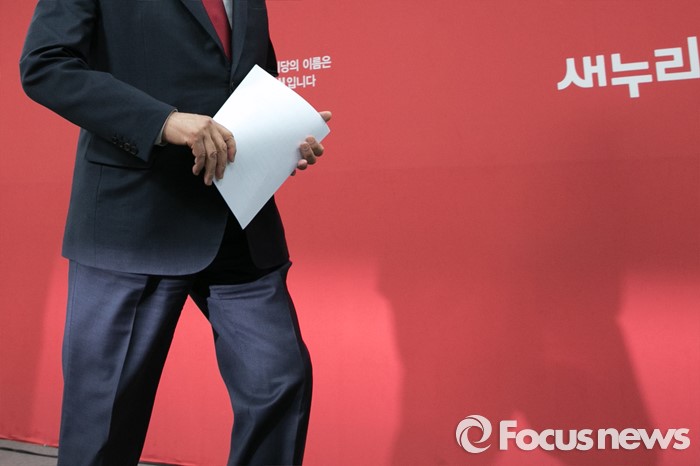 (서울=포커스뉴스) 김무성 새누리당 대표가 24일 오후 서울 여의도 당사 브리핑실에서 기자회견을 마친 뒤, 단상을 내려오고 있다. 이 자리에서 김 대표는 "서울 은평구(을), 송파구(을), 대구 동구(갑), 동구(을), 달성군 등 최고위 의결이 보류된 5곳에 대한 공천관리위원회의 결정에 대해서 의결을 하지 않기로 결정 했다"고 말했다.
