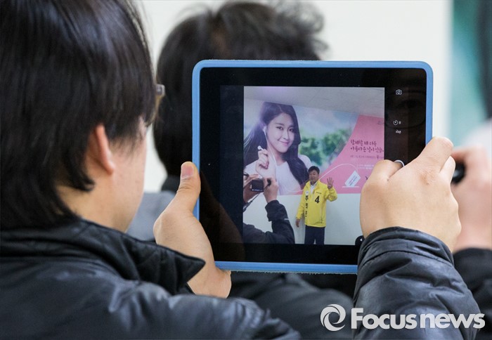 (서울=포커스뉴스) 24일 오후 서울 노원구선거관리위원회를 찾은 주희준 정의당 노원병 후보가 후보자 등록을 마친 후4.13 총선 홍보대사인 설현의 현수막 앞에서 기념촬영을 하고 있다.
