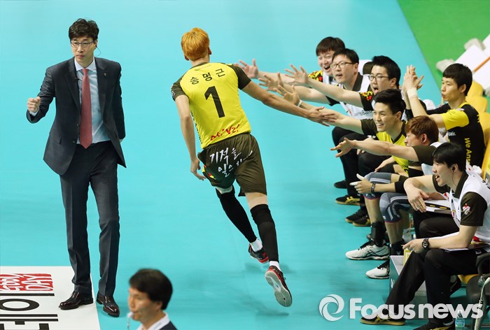 (안산=포커스뉴스) 24일 안산상록수체육관에서 열린 2015-2016 V-리그 남자부 챔피언결정전 4차전 OK저축은행-현대캐피탈 경기에서 OK저축은행 송명근이 스파이크 서브를 넣은후 공격을 성공시키고 벤치의 동료들과 손바닥을 마주치고 있다.