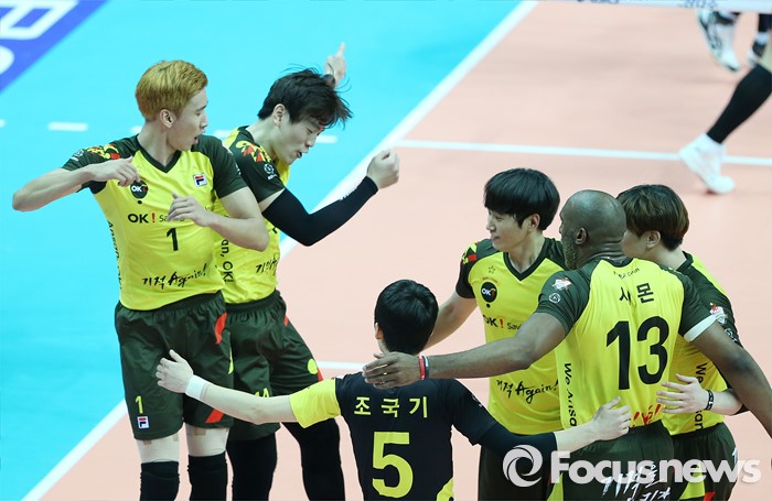 (안산=포커스뉴스) 24일 안산상록수체육관에서 열린 2015-2016 V-리그 남자부 챔피언결정전 4차전 OK저축은행-현대캐피탈 경기에서 OK저축은행 송명근(왼쪽)과 송희채가 뛰어올라 몸을 부딪치며 블로킹 득점을 기뻐하고 있다.