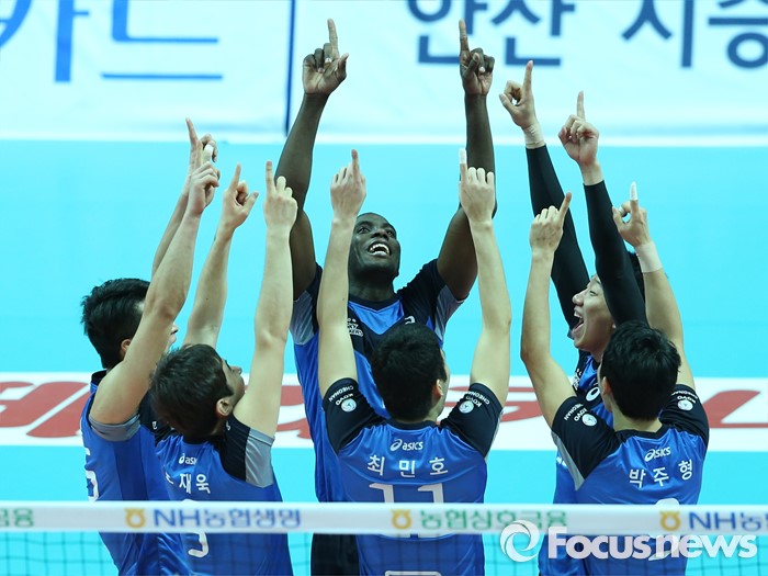 (안산=포커스뉴스) 24일 안산상록수체육관에서 열린 2015-2016 V-리그 남자부 챔피언결정전 4차전 OK저축은행-현대캐피탈 경기에서 현대캐피탈신영석이 스파이크 서브로 득점을 올리고 동료들과 환호하고 있다.