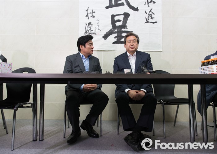 (부산=포커스뉴스) 당 공천관리위원회의 공천안에 반발해 최고위원회의 소집을 거부한 김무성(오른쪽) 새누리당 대표와 설득에 나선 원유철 원내대표가 24일 오후 부산 영도구 김 대표 사무실에서 만나 대화를 나누고 있다.
