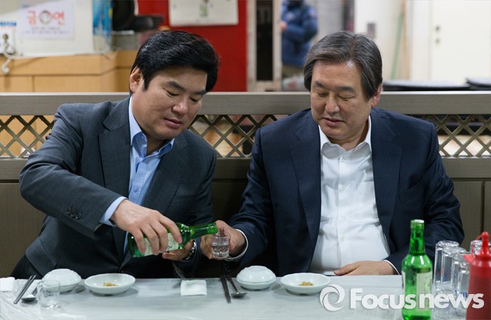 (부산=포커스뉴스) 당 공천관리위원회의 공천안에 반발해 최고위원회의 소집을 거부한 김무성(오른쪽) 새누리당 대표와 설득에 나선 원유철 원내대표가 24일 오후 부산 중구 자갈치시장에서 만나 저녁식사를 하고 있다.