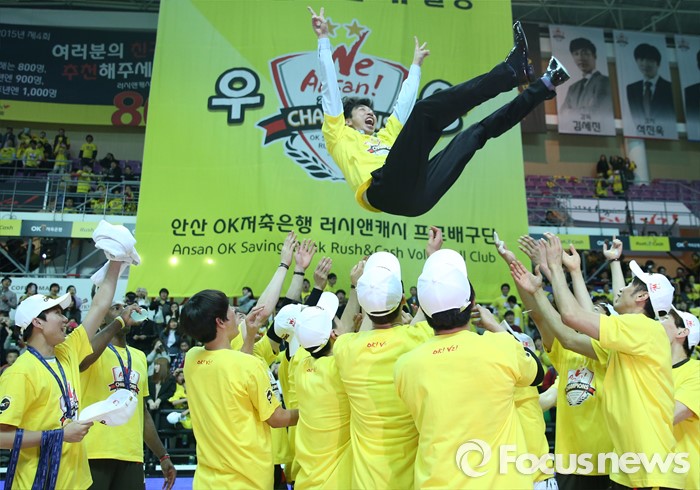 (안산=포커스뉴스) 24일 안산상록수체육관에서 열린 2015-2016 V-리그 남자부 챔피언결정전에서 현대캐피탈을 3승1패로 물리치고 2연패를 달성한 OK저축은행 선수들이 김세진 감독을 헹가래하고 있다.