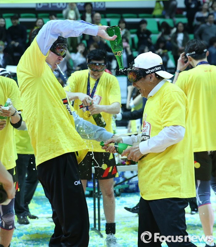 (안산=포커스뉴스) 24일 안산상록수체육관에서 열린 2015-2016 V-리그 남자부 챔피언결정전에서 현대캐피탈을 3승1패로 물리치고 2연패를 달성한 OK저축은행 김세진 감독이 샴페인을 뿌리고 있다.