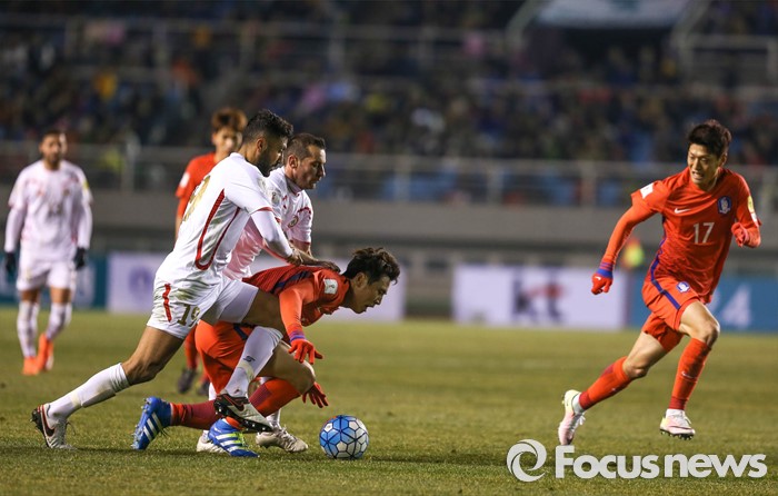 (안산=포커스뉴스) 24일 오후 경기도 안산 와스타디움에서 열린 2018 러시아 월드컵 아시아 2차 예선 7차전 대한민국 대 레바논 경기에서 구자철 선수가 레바논 선수들과 볼다툼을 하고 있다.