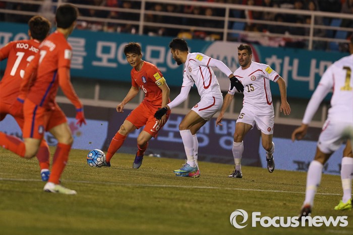 (안산=포커스뉴스) 24일 오후 경기도 안산 와스타디움에서 열린 2018 러시아 월드컵 아시아 2차 예선 7차전 대한민국 대 레바논 경기에서 기성용 선수가 볼다툼을 하고 있다.