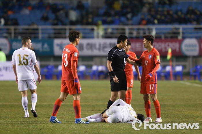 (안산=포커스뉴스) 24일 오후 경기도 안산 와스타디움에서 열린 2018 러시아 월드컵 아시아 2차 예선 7차전 대한민국 대 레바논 경기에서 이청용 선수(17번)가 경기 중 쓰러진 레바논 선수 곁에서 심판과 대화를 나누고 있다.