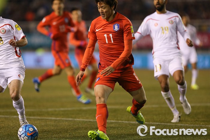 (안산=포커스뉴스) 24일 오후 경기도 안산 와스타디움에서 열린 2018 러시아 월드컵 아시아 2차 예선 7차전 대한민국 대 레바논 경기에서 황의조 선수가 드리블을 하고 있다.