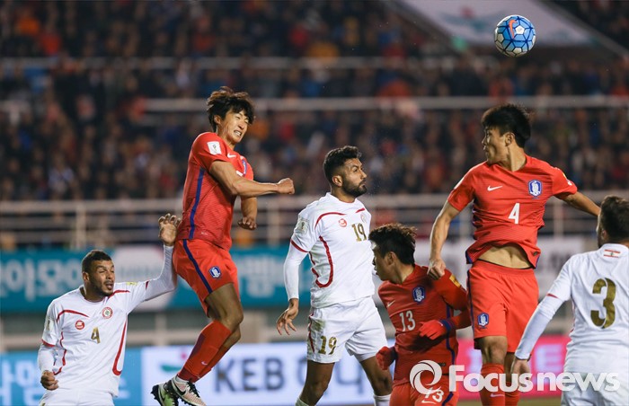 (안산=포커스뉴스) 24일 오후 경기도 안산 와스타디움에서 열린 2018 러시아 월드컵 아시아 2차 예선 7차전 대한민국 대 레바논 경기에서 양 팀 선수들이 공중볼 다툼을 하고 있다.