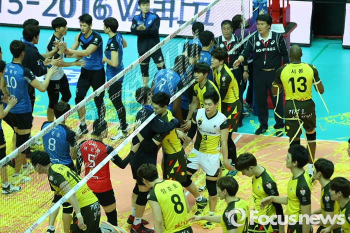 (안산=포커스뉴스) 24일 안산상록수체육관에서 열린 2015-2016 V-리그 남자부 챔피언결정전 4차전에서 OK저축은행이 현대캐피탈을 물리치고 3승1패로 2연패를 달성했다. 경기를 마치고 양팀 선수들이 악수를 나누며 치하하고 있다.